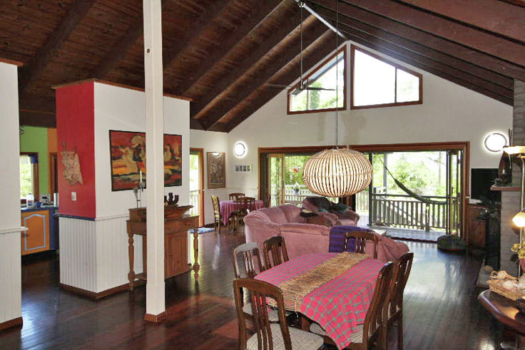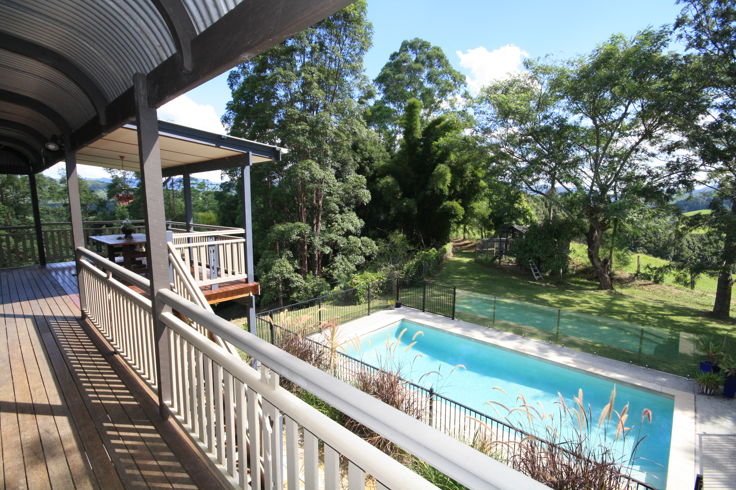 Open plan kitchen, dining and lounge that is framed by high raked ceilings and polished hardwood timber floorboards that flows out to a wrap- around bullnose verandah overlooking the inground pool with views to Mt Warning.