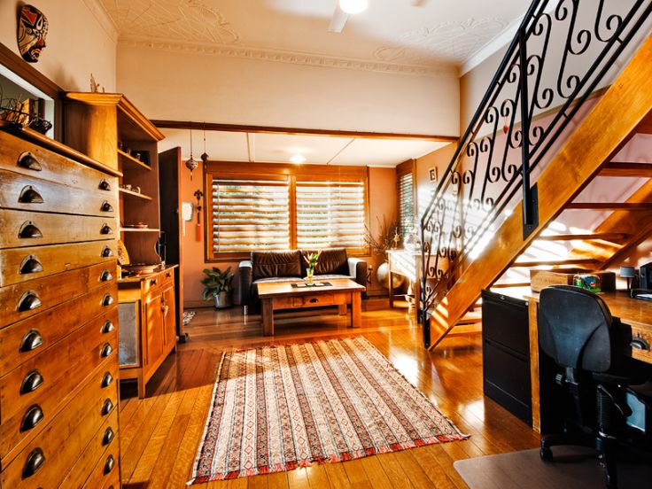 Internal timber and wrought iron staircase which flows upstairs to a large family room.
